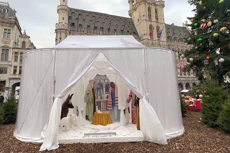 Na brukselskiej Grand Place, wpisanej na listę UNESCO, stanęła w tym roku nietypowa szopka bożonarodzeniowa. Drewniane figury znane z poprzednich lat zastąpiła instalacja pt. „Fabrics of the Nativity”, wykonana przez artystkę Victorię-Marię Geyer z recyklingowanych tkanin. Postaci – Maryja, Józef, pasterze – nie mają twarzy, a jedynie zarysowane kształty z beżowych i brązowych tkanin.
