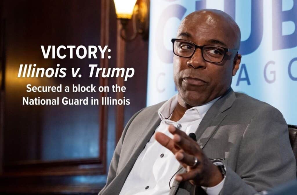 Illinois zaskarżyło między innymi plan rozmieszczenia Gwardii Narodowej w Chicago wbrew sprzeciwowi gubernatora i władz lokalnych. Federalny sędzia szybko zablokował te działania, a Sąd Najwyższy odmówił administracji rozpatrzenia pilnego odwołania. W efekcie prezydent wycofał się z planu.