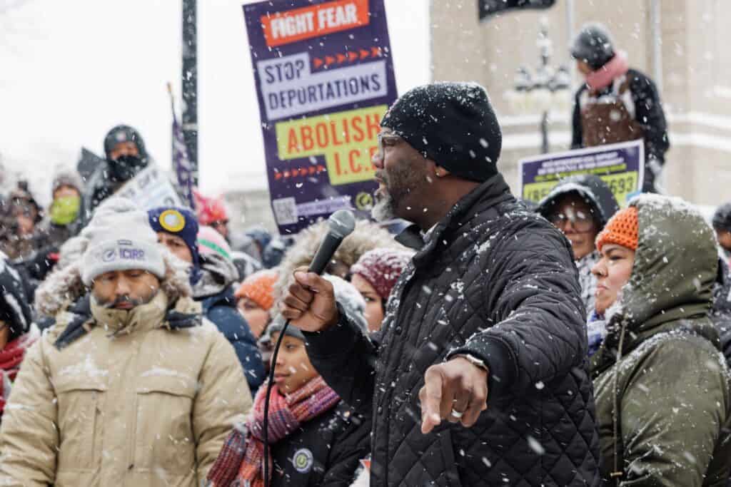 Burmistrz Brandon Johnson wygłasza przemówienie uczestnicząc w nadzwyczajnym wiecu i marszu protestacyjnym „Ice Out of Everywhere”: Stop zabójstwom! Sprawiedliwość dla wszystkich. 25 stycznia 2026 r.