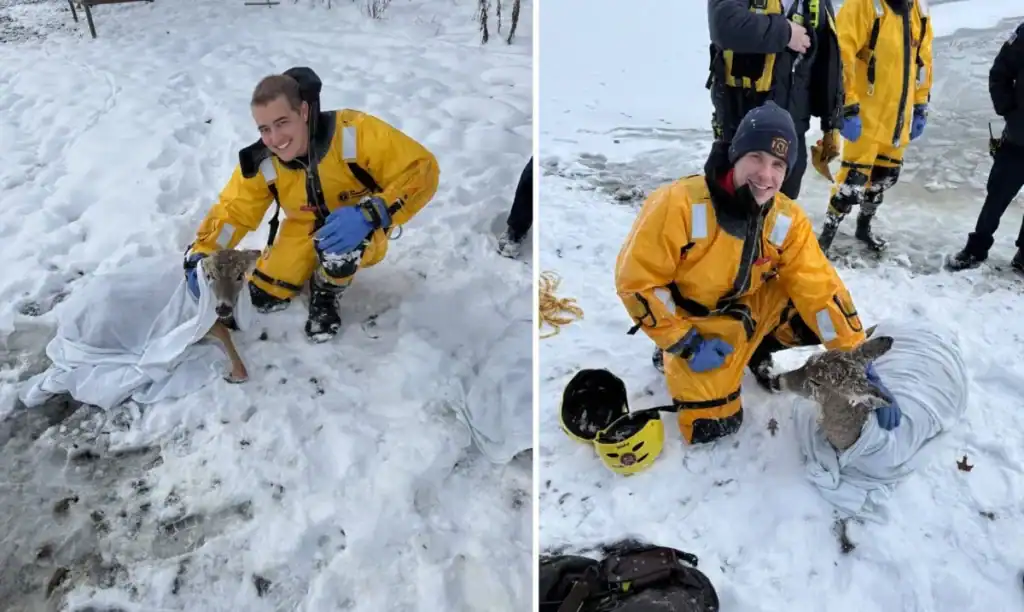 Służby ratunkowe zostały wezwane pod adres 3700 Pitzen Road po zgłoszeniu od mieszkańca, który zauważył zwierzęta uwięzione na lodzie, około 50 stóp od linii brzegowej jeziora. Po przybyciu na miejsce strażacy potwierdzili, że oba jelenie wpadły do lodowatej wody i nie były w stanie się uwolnić.