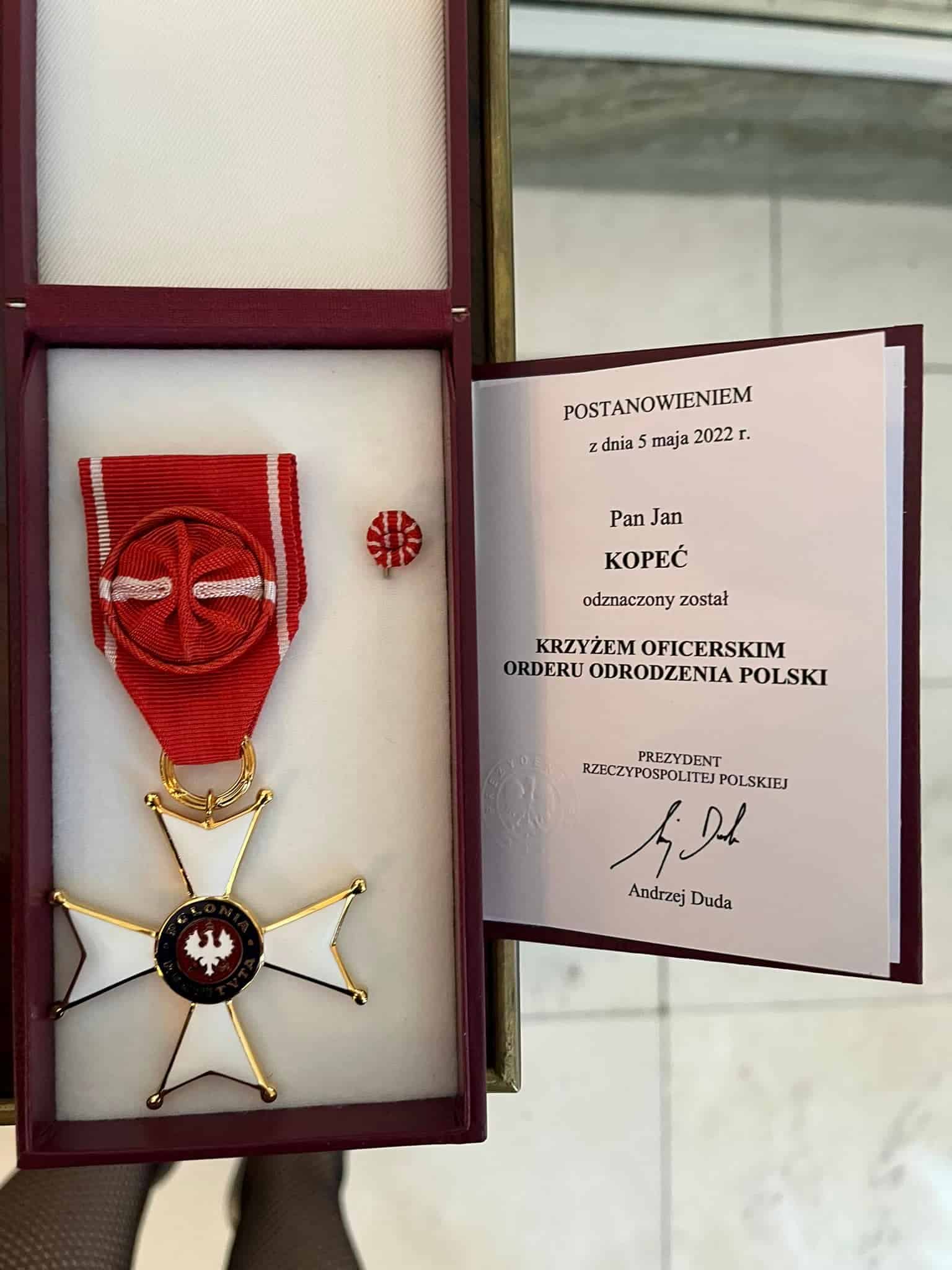 Polak mieszkający od dziesięcioleci w Chicago otrzymał Order Odrodzenia Polski w klasie oficerskiej czyli czwartej. Zgodnie z państwową zasadą Jan Kopeć, będzie musiał ten medal nosić na lewej stronie piersi.