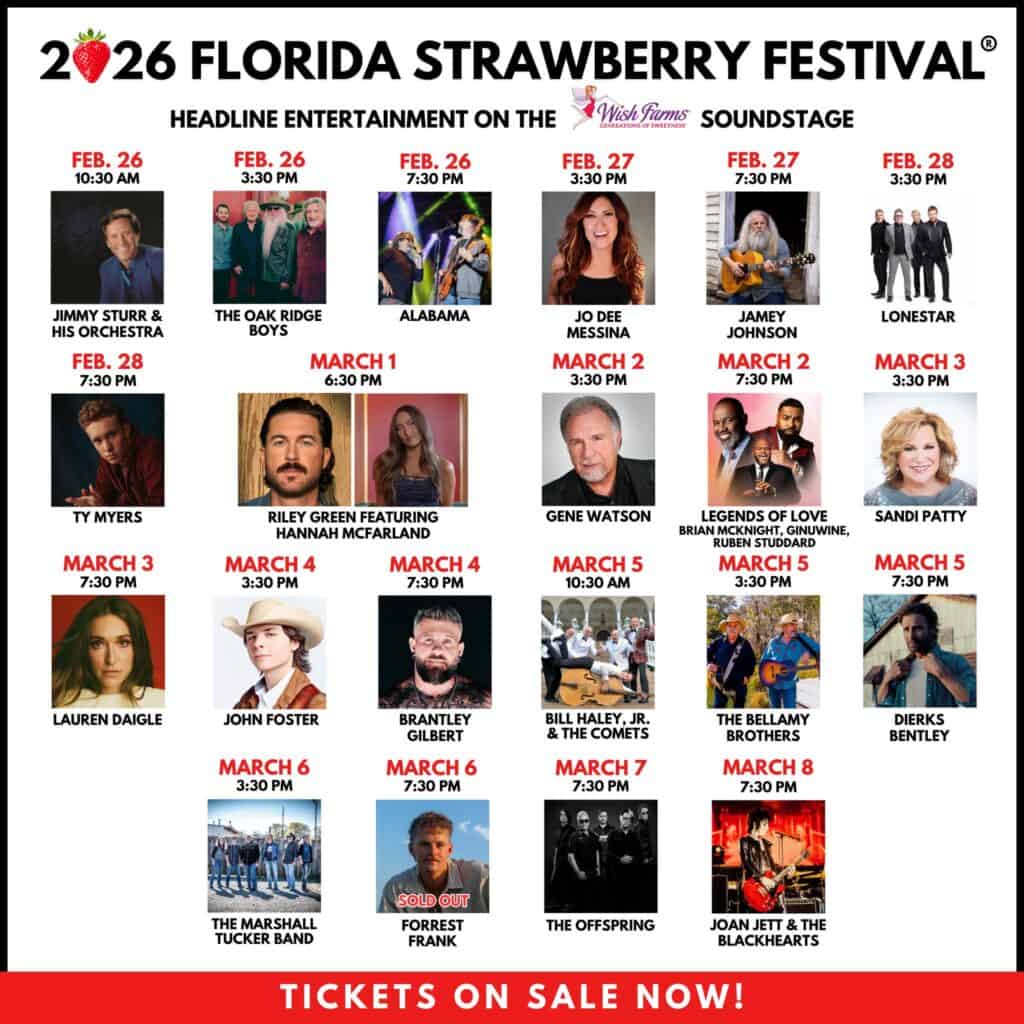 Florida Strawberry Festival od dekad łączy elementy jarmarku, wystawy rolniczej i wydarzenia kulturalnego. Na odwiedzających czekają koncerty, atrakcje wesołego miasteczka, prezentacje rolnicze, sztuka oraz szeroka oferta gastronomiczna. Jednym z najbardziej rozpoznawalnych punktów programu pozostaje stoisko „Make Your Own” Shortcake Booth.