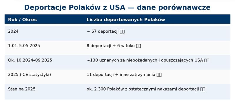 Według informacji udzielonych w odpowiedzi na interpelację posłanki Marty Stożek (Razem), w 2025 roku nakaz opuszczenia USA otrzymało około 130 Polaków, podczas gdy rok wcześniej liczba ta wyniosła ok. 70 osób.