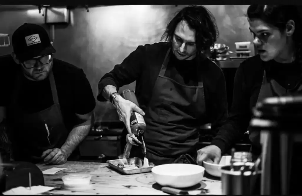 Właściciele i szefowie kuchni Warlord John Lupton, Trevor Fleming i Emily Kraszyk w kuchni.