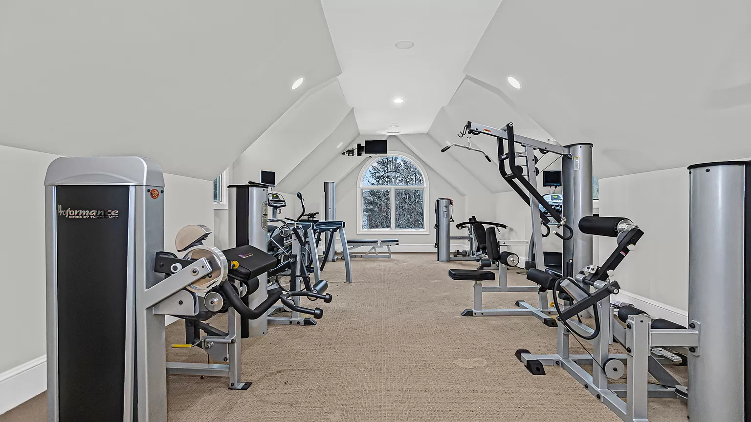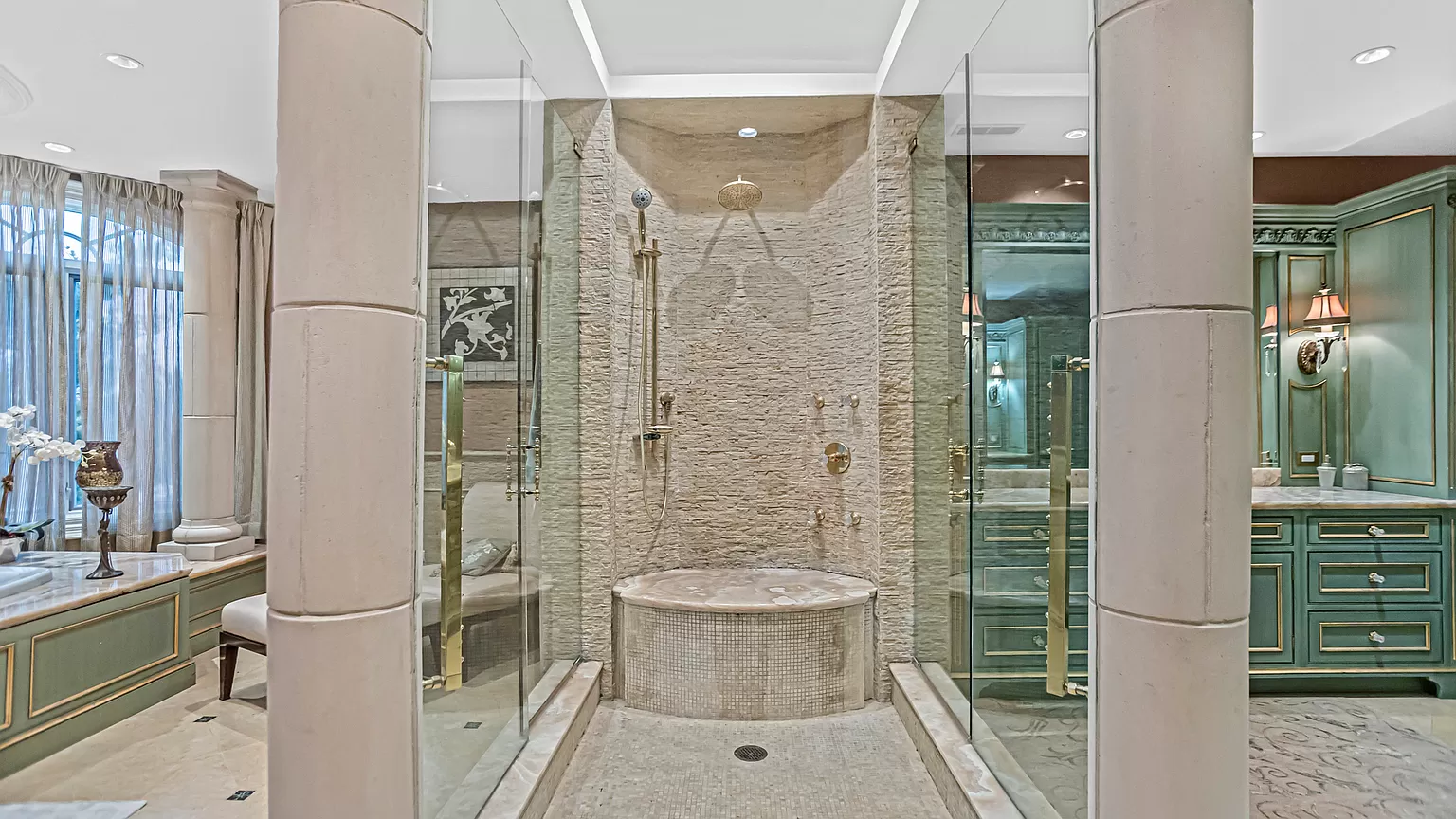 Inne godne uwagi udogodnienia tej posiadłości obejmują ogromną domową siłownię, saunę, oraz „oazę na świeżym powietrzu”, która obejmuje basen z podwójną kamienną zjeżdżalnią.