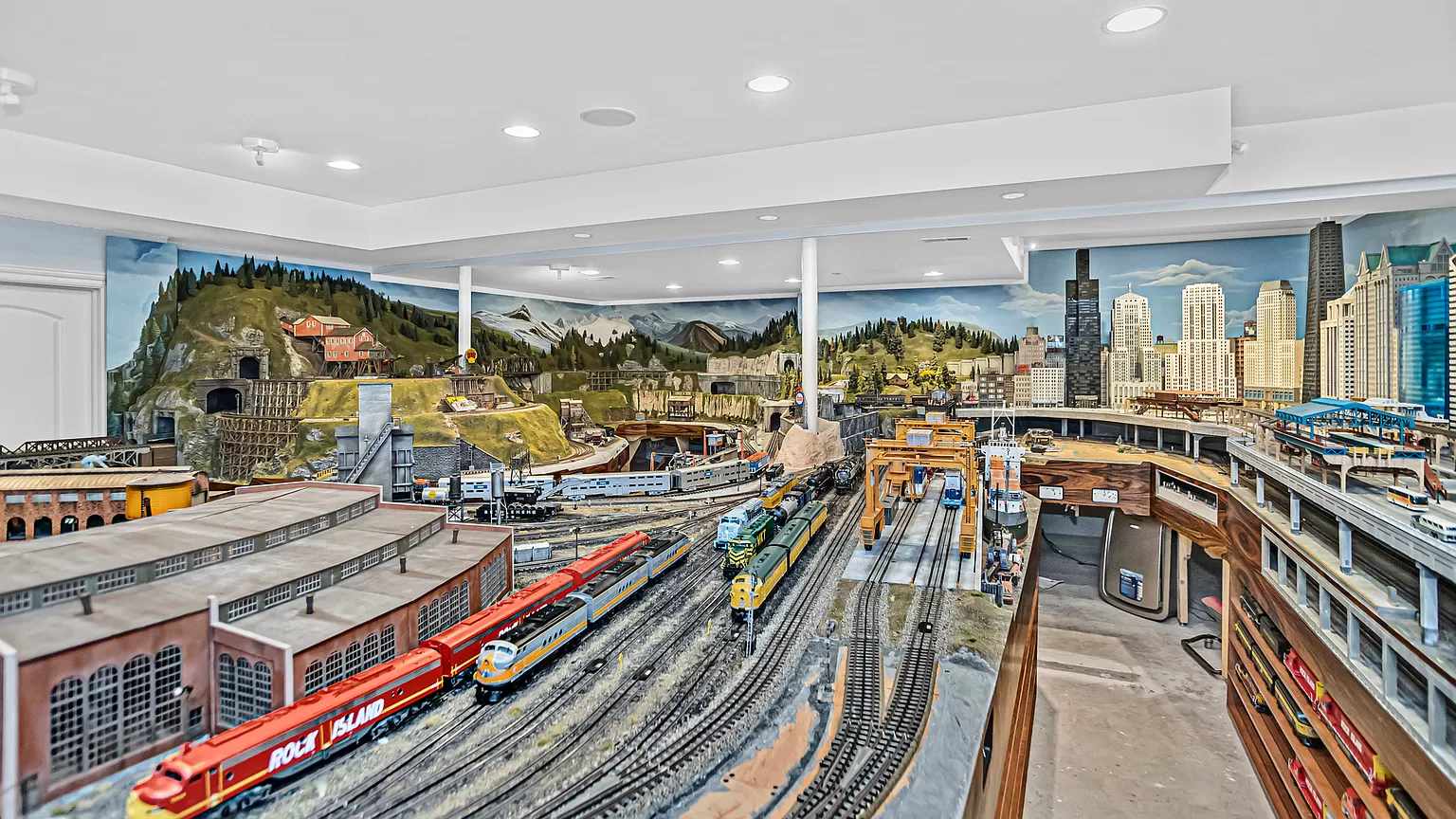 W wystawionej na sprzedaż rezydencji na przedmieściach Northbrook czeka niespodzianka, która z pewnością zachwyci miłośników kolei – jeden z pokoi zawiera imponującą wystawę modeli pociągów.