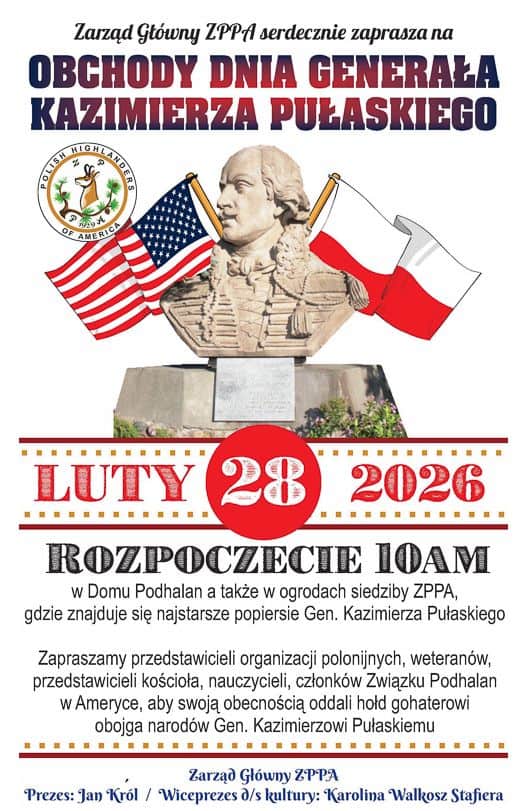 Zarząd Główny Związku Podhalan w Północnej Ameryce ma zaszczyt i przyjemność zaprosić Państwa do udziału w Obchodach Dnia Generała Kazimierza Pułaskiego, które odbędą się w sobotę, 28 lutego 2026 roku, o godz. 10:00, w Domu Podhalan oraz ogrodach siedziby Związku Podhalan w Ameryce.