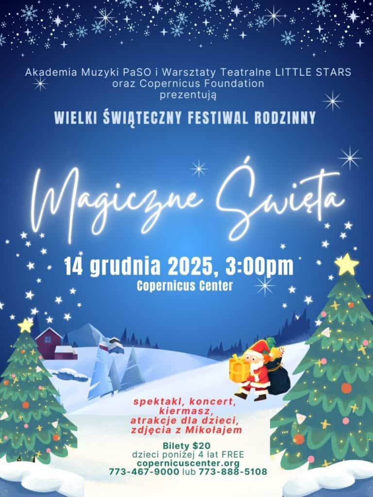 W niedzielę 14 grudnia, od godziny 11:00am do 6:00pm, w Copernicus Center odbędzie się wyjątkowe wydarzenie – Wielki Świąteczny Festiwal Rodzinny „MAGICZNE ŚWIĘTA”. Początek programu scenicznego zaplanowano na 03:00pm, główne wejście zostanie otwarte o 11:00am, natomiast wejście do teatru o 02:00pm. Wydarzenie jest skierowane do publiczności w każdym wieku.