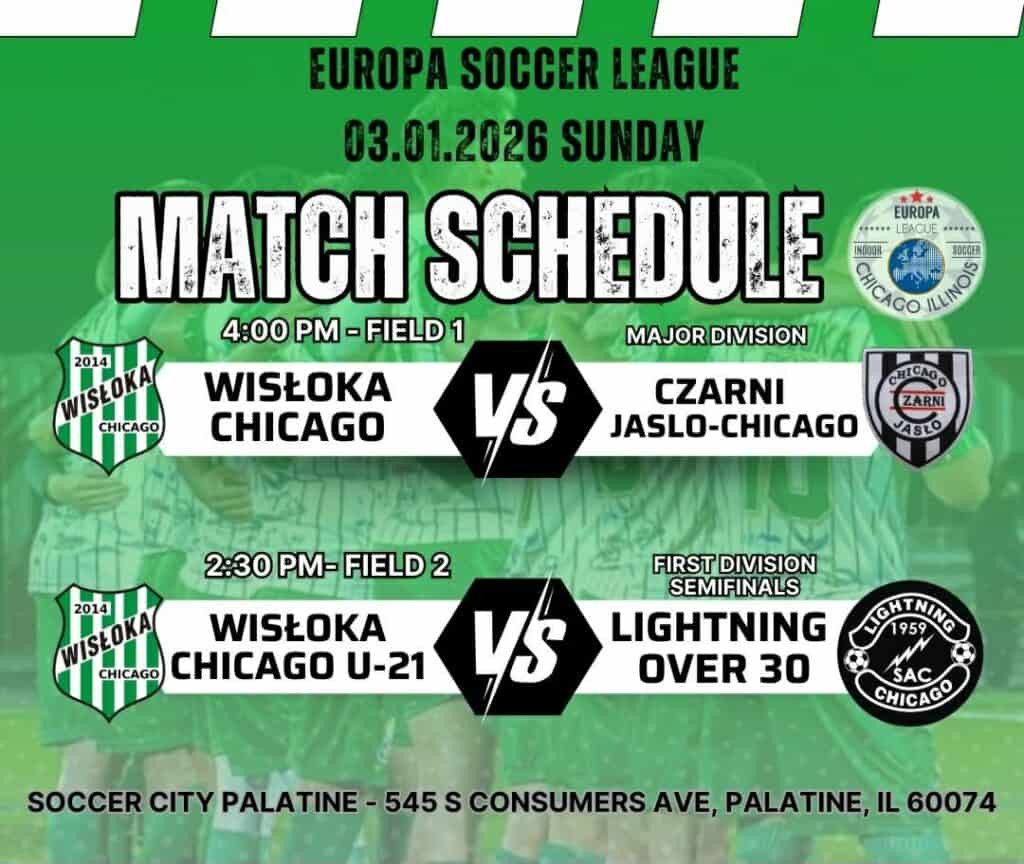 Mecz Wisłoka Chicago vs Diverse City FC odbędzie się 10 listopada o godzinie 5.00PM na Redmond Complex Bensenville, przy 700 John St, Bensenville. Wstęp wolny.