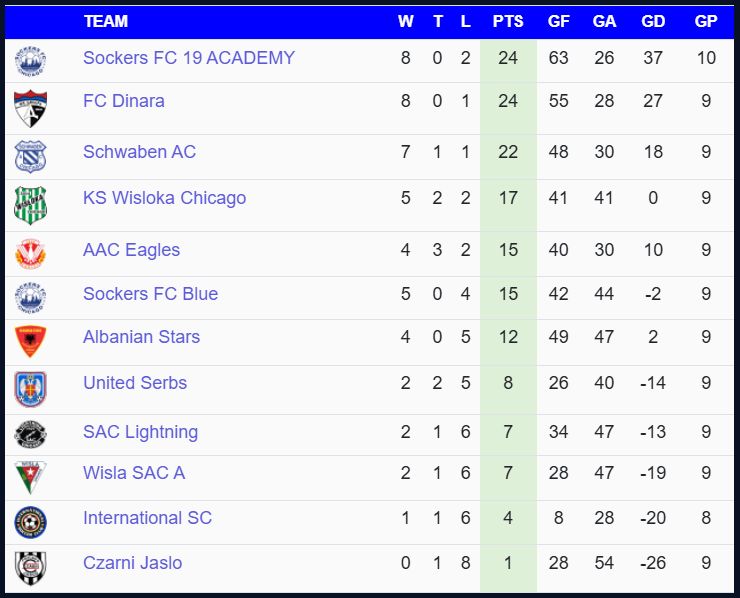 W najwyższej Major Division podstawowy zespół chicagowskiej Wisłoki zmierzy się z Czarnymi Jasło/Chicago o godzinie 4:00 pm. Nieco wcześniej, o 2:30 pm, młodzieżowa drużyna powalczy o awans w półfinale play offs First Division z prowadzącym w tabeli zespołem Lightning over30.