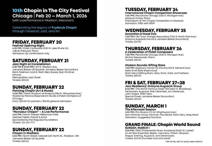 W tym przełomowym roku odbędzie się uznany spektakl Hershey Felder Monsieur Chopin w Harris Theater, wystąpią: Jaroslaw Bester Quartet, Metropolitan Jazz Octet, Katie Ernst, Matt Ulery’s Sifting Stars, Quin Kirchner Quartet, Grazyna Auguścik Group, Michał Drewnowski, Mateusz Dubiel oraz uwielbiany przez całe rodziny Painting Chopin.