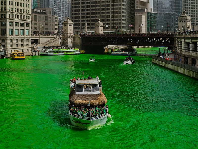Jednym z najbardziej rozpoznawalnych symboli obchodów jest tradycyjne barwienie rzeki Chicago. W 2026 roku wydarzenie zaplanowano na sobotę 14 marca o godzinie 10:00 rano. Najbardziej spektakularna zmiana koloru następuje w ciągu pierwszych 30–45 minut, choć zielony odcień utrzymuje się przez kilka godzin.