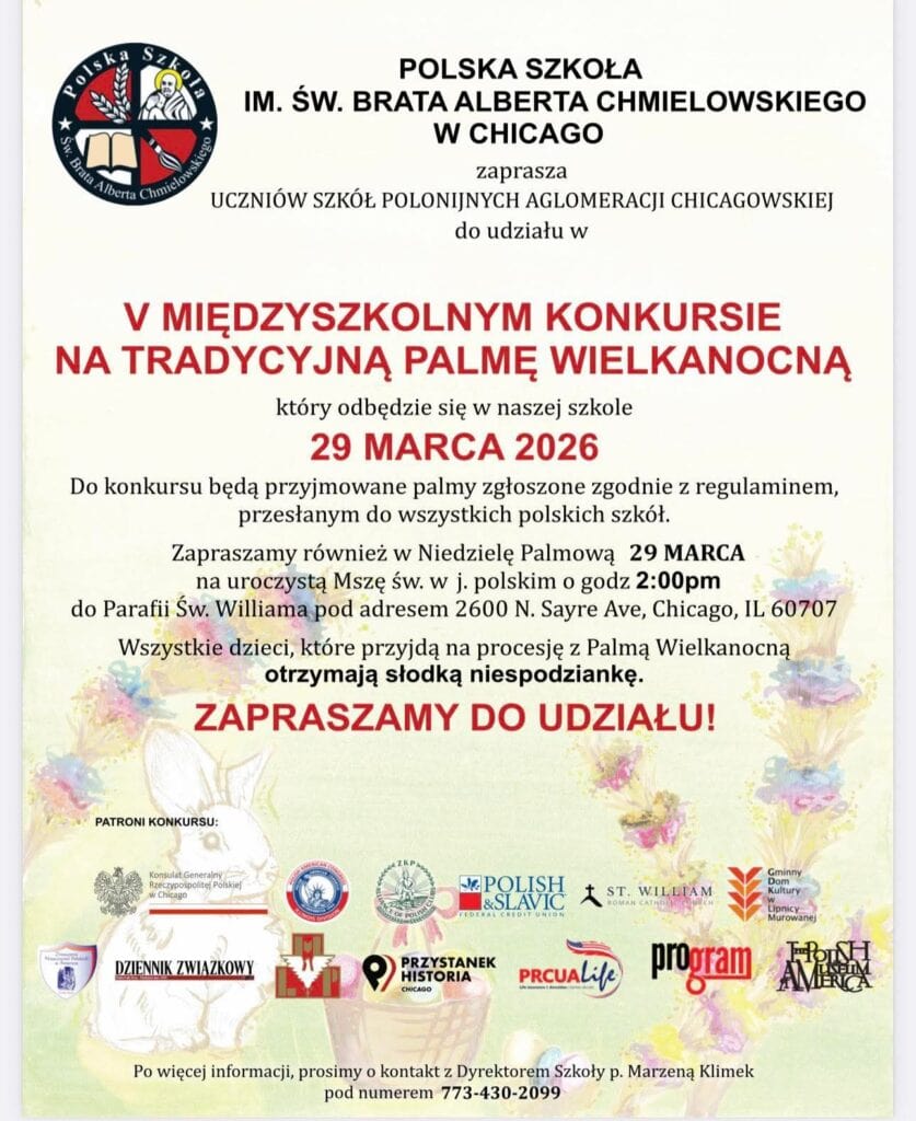Polska Szkoła im. św. Brata Alberta Chmielowskiego w Chicago zaprasza uczniów szkół polonijnych aglomeracji chicagowskiej do udziału w V Międzyszkolnym Konkursie na Tradycyjną Palmę Wielkanocną. Wydarzenie ma na celu podtrzymywanie polskich tradycji wielkanocnych oraz integrację młodzieży uczącej się w polskich szkołach w rejonie Chicago.